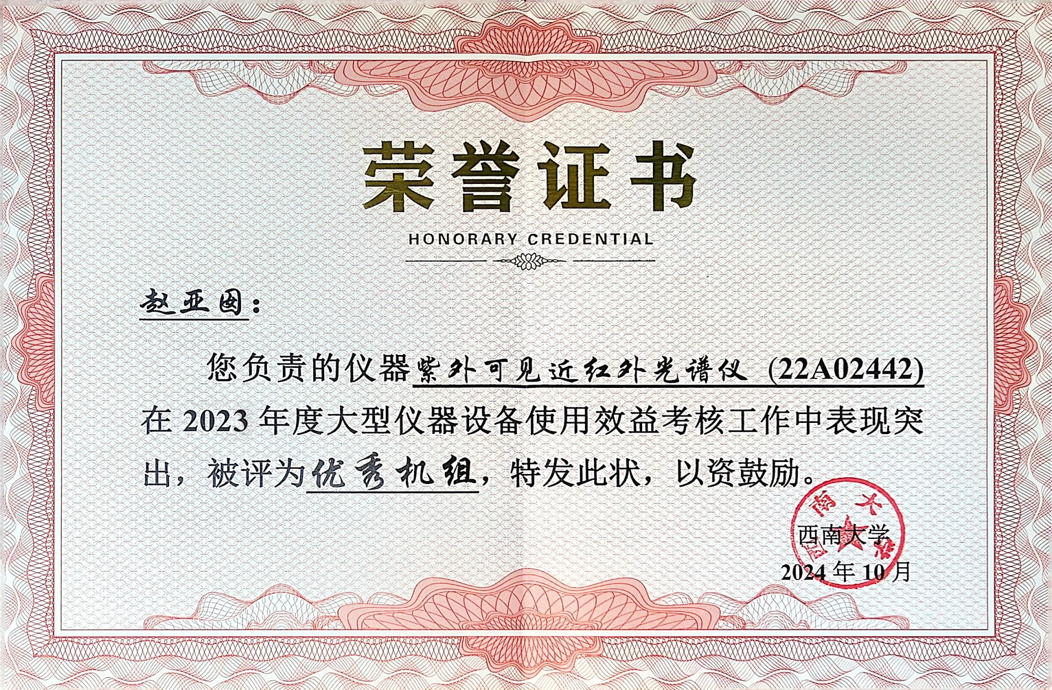 该仪器由赵亚囡老师负责,在日常管理中赵老师充分发挥主观能动性,能够迅速诊断仪器故障,快速排除故障,保证仪器的高效运行。能够迅速判断样品测试过程中的难点及解决办法和注意的问题,保证样品的准确测试。为提高仪器的使用效率,该仪器可通过自主测试和送样测试两种方式进行预约,并不定期为提出培训申请的校内师生提供理论和上机培训。同时,赵老师通过建立西大分测中心分子光谱交流QQ群,构建良好的学习交流的平台。截止目前,该仪器每年服务对象涵盖化学、物理、材料、食品、工程等学科的校内课题组30余个,累计培训自主测试学生130余人。对校外服务单位有四川大学、陕西科技大学、陕西理工大学、西南交通大学、重庆大学、伊犁师范大学、重庆邮电大学、中科院绿色智能研究院等科研单位,以及重庆市优胜科技生物有限公司、湖北菲利华石英玻璃股份有限公司等企业单位。