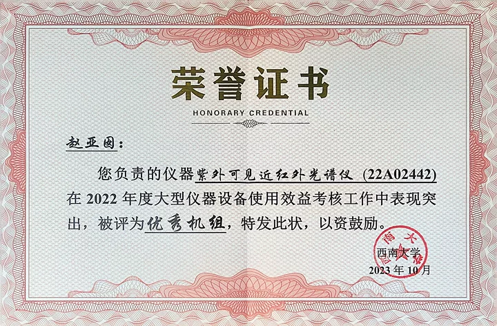 分析测试中心作为校级综合性测试平台,为满足多个学科测试的需要,紫外可见近红外光谱仪配备有积分球装置,变温测试装置,直射光检测系统等。该设备原值58.7万元,可用于研究和分析不同物质在紫外光、可见光及近红外范围内的光学性能测试。该设备广泛应用于化学化工、新材料、高分子、物理、食品、生物、医药等领域样品的定性定量分析,以及玻璃、固体粉末、薄膜、镀膜光学材料的透过、反射、漫反射测定。自2021年购置以来,该仪器所使用学科比较多,样品来源广泛,样品种类差异大,样品数量大,特别是解决了学校师生测试固体样品,薄膜样品、粉末样品的光学信号的测试需求。该机组在学校大型仪器设备年度使用绩效考核工作中表现突出,连续两年(2022-2023年度)被评为西南大学“优秀机组”。
